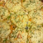 4. Follow the biscuit mix package’s instructions and once ready, portion the dough into about 1/4 cup size dollops, dropping them on the chicken-veggie blend.